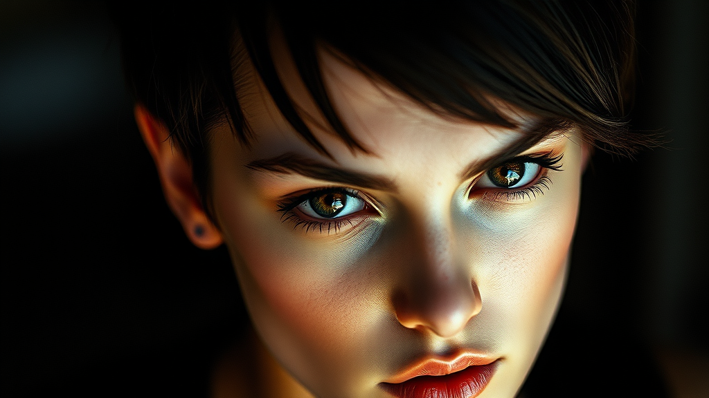A striking portrait of a young woman with an edgy hairstyle and intense, captivating eyes. The image is captured in a high-contrast technique, highlighting the model's defined features with dramatic shadows and bright highlights. Shot with a film camera and a fast prime lens, the photo exudes a gritty, authentic vibe. This portrait is ideal for use in fashion editorials, advertising campaigns, or as an eye-catching piece of wall art.