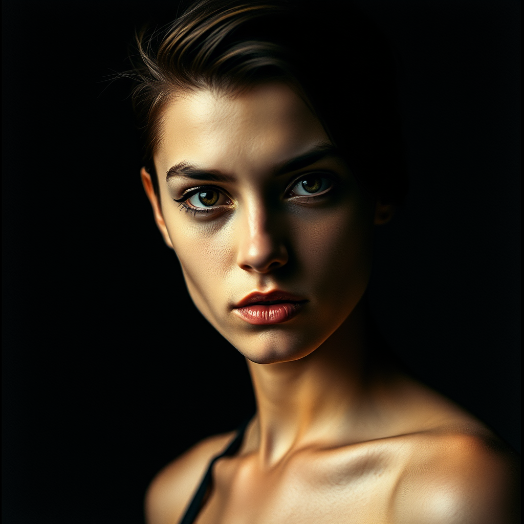 A striking portrait of a young woman with an edgy hairstyle and captivating eyes. The photograph captures a high-contrast aesthetic, accentuating the model's angular features with deep shadows and bright highlights. Taken with a vintage film camera and a fast prime lens, the image exudes a gritty, raw texture that is ideal for fashion editorials, marketing campaigns, or as a bold statement piece for wall decor.