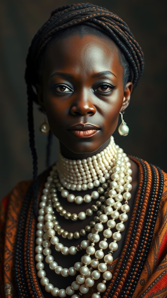 A striking portrait of an African woman adorned with an intricately beaded shawl and an elegant pearl necklace. The image is infused with afrofuturism elements, capturing the essence of Ororo Munroe with a nod to the grace of Maria Borges. She exudes regal charm as the beautiful animal pearl queen, her attire glistening with strings of lustrous pearls. Her dress, a masterpiece of beadwork, draws inspiration from the powerful visual storytelling of Carrie Mae Weems and the evocative imagery of Gordon Parks. This scene, reminiscent of an artwork by Lily Delissa Joseph, beautifully showcases the fusion of traditional beauty and future-forward aesthetics.