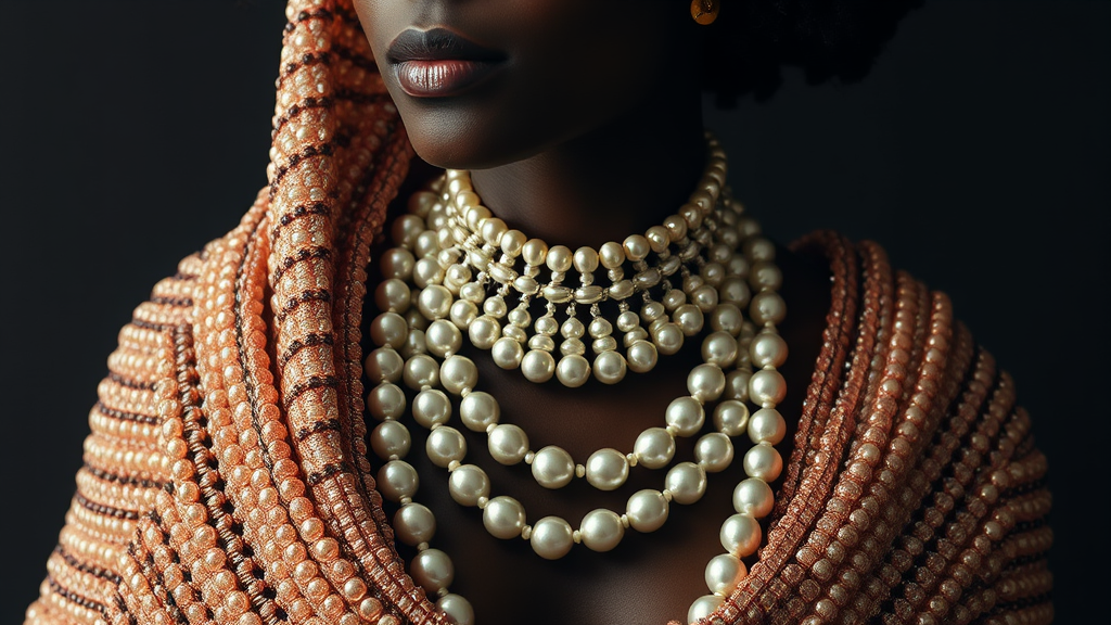 A striking portrait of an Arafed woman adorned in a beaded shawl and an elegant pearl necklace, inspired by the essence of Ororo Munroe and Maria Borges, capturing the spirit of Afrofuturism. Her attire, a mesmerizing dress crafted entirely from shimmering beads, evokes the timeless beauty and strength of a pearl queen. Strings of pearls elegantly intertwine, adding layers of sophistication and grace. The composition draws inspiration from the artistic vision of Carrie Mae Weems and the dynamic storytelling of Gordon Parks. This evocative photograph, reminiscent of Lily Delissa Joseph’s style, celebrates the power, beauty, and cultural richness of a modern black woman within an Afrofuturistic narrative.