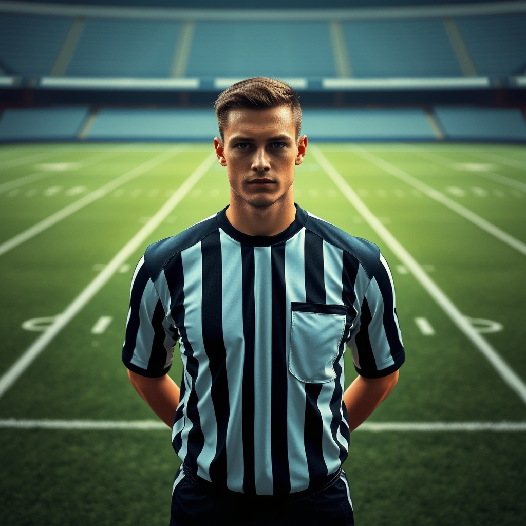 A striking portrait of an attractive person dressed in a football referee uniform, standing confidently at the center of a football field. The figure is captured looking directly at the viewer, showcasing detailed skin with a hyperrealistic quality. The photo is shot in a highly detailed, full-length frame with diffused soft lighting and a sharp focus, embodying cinematic lighting aesthetics. The scene is presented in 8k resolution with a shallow depth of field, and is reminiscent of CGI artistry. Notable for its impressive clarity and vibrant RAW colors, the photograph exudes realism with a touch of creative flair, while avoiding common visual distortions or errors such as blurriness, mutations, or disproportionate features.