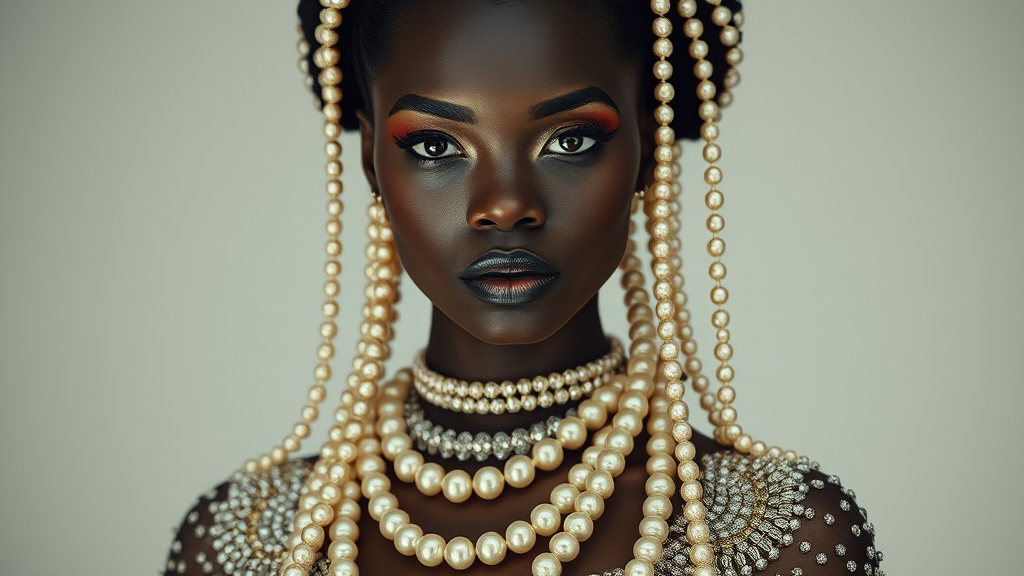 A striking portrait of an elegant Afro-futuristic woman clad in a gown crafted from shimmering beads, with cascading strings of luminescent pearls draped across her shoulders and neck. Her presence is regal, evoking images of a mythical pearl queen, embodying the grace of Ororo Munroe and the timeless beauty of Maria Borges. Her attire—a harmonious blend of intricate beadwork and radiant pearls—draws inspiration from the iconic works of Carrie Mae Weems and Gordon Parks. Her gaze is captivating, reflecting strength and serenity, set against a world where culture and futurism coalesce, reminiscent of a photograph by Lily Delissa Joseph.