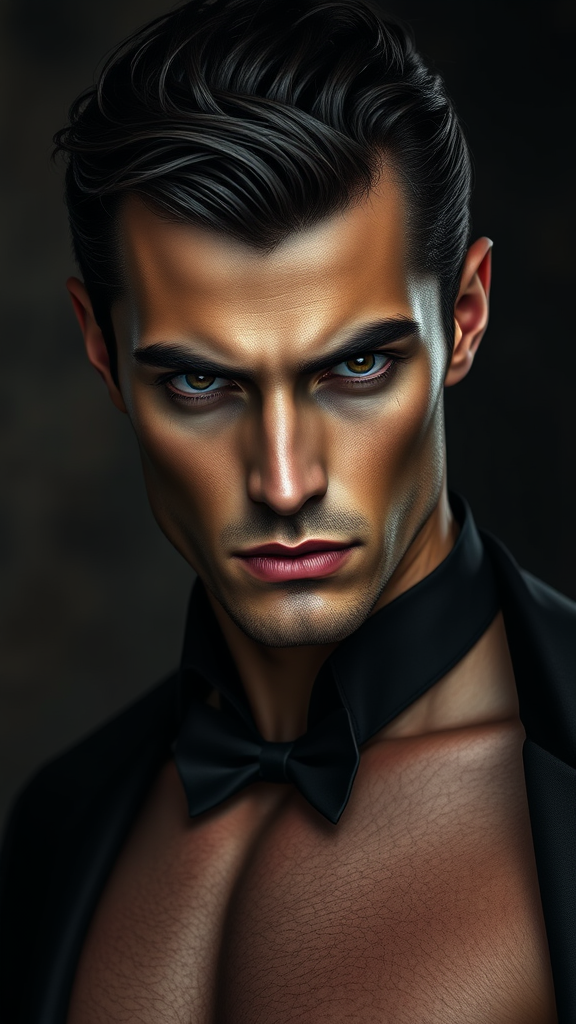 A striking portrait of an elegant and handsome dark bohemian vampire, characterized by a muscular build and a highly detailed face. The vampire's perfect eyes feature round pupils, creating an intense gaze. The anatomy is accurately depicted, enhanced by dramatic lighting that adds depth and shadow while preserving soft details. The composition is rich in texture and clarity, rendered in ultra-high definition—4k and 8k quality. The artistry is inspired by the styles of Edmund Blair Leighton, Brom, and Charlie Bowater, with facial features akin to those created by Tom Bagshaw and Sargent. The mood combines timeless grace with a dark, mysterious allure, capturing the essence of a classic yet modern vampire theme.