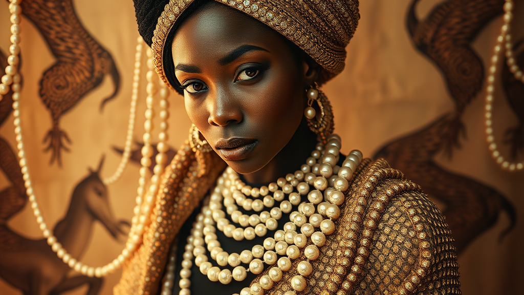 A striking portrait of an elegant ara Eastern woman adorned with a shimmering beaded shawl and delicate pearl necklace, capturing the essence of Ororo Munroe in an afrofuturism style. Her visage holds the regal poise reminiscent of Maria Borges, a true pearl queen surrounded by beautiful animal motifs. She is draped in a dress intricately woven with beads, embodying the essence of a modern goddess. The scene is inspired by the soulful storytelling of Carrie Mae Weems and the powerful imagery of Gordon Parks, emphasizing the beauty and strength of a black woman. Her commanding presence is reminiscent of Lily Delissa Joseph’s aesthetic, fusing timeless elegance with a futuristic flair. Strings of pearls flow around her, creating an ethereal atmosphere, as if she embodies a mythical figure from an afrofuturistic realm.