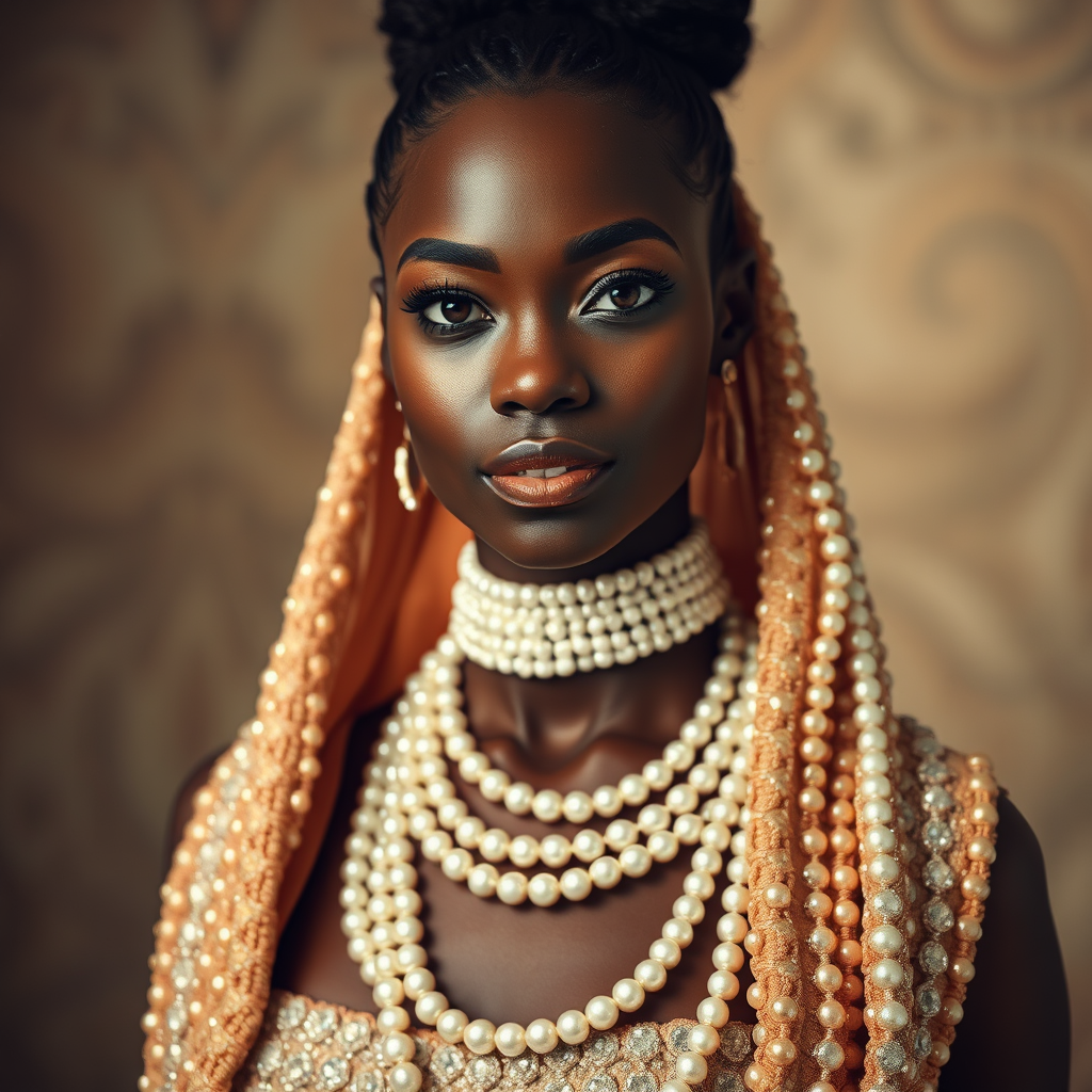 A striking portrait of an elegant woman adorned with a beaded shawl and a radiant pearl necklace, capturing the essence of Ororo Munroe in an Afrofuturism style. Her presence rivals that of Maria Borges, embodying the regal grace of a beautiful pearl queen. Strings of lustrous pearls cascade with elegance, echoing the artistic influence of Carrie Mae Weems. The dress is a masterpiece of intricate beadwork, inspired by the visual storytelling of Gordon Parks. This photograph of a black woman, reminiscent of Lily Delissa Joseph's artistry, embodies the spirit of contemporary and timeless beauty. Subtle creative flourishes add a unique touch to this vision of Afrofuturistic elegance.