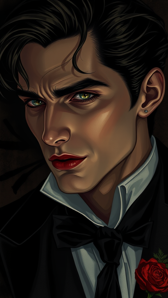 A striking portrait of an elegantly handsome, enigmatic dark bohemian vampire, exuding an air of ennui, depicted in an illustration with dramatic chiaroscuro lighting and gentle, refined details, reminiscent of an oil painting on canvas. The art style blends the romantic flair of art nouveau with contemporary realism, capturing the essence of classic elegance. The vampire's features are meticulously rendered, akin to the works of Edmund Blair Leighton, imbued with the moody atmosphere of Brom, and the dynamic character portrayal seen in Charlie Bowater's pieces. The piece is designed to captivate, utilizing octane render for a high-definition, immersive 8k presentation, reminiscent of an homage trending on ArtStation, with a nuanced portrayal of faces inspired by Tom Bagshaw, and the narrative depth and technique of Sargent.
