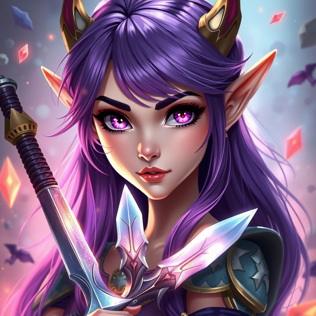 A striking portrait of an elf girl with vibrant purple hair, holding a shimmering sword. Her ethereal features are framed by a backdrop of fantasy elements that highlight her mystical aura. The style blends rossdraws' dynamic and vibrant cartoon techniques with the elegance of wlop and the intricate detail of artgerm, creating a stunning piece of digital character art. Her expressive eyes and commanding presence captivate, as hints of light and shadow play across her face, reminiscent of both traditional fantasy lore and modern digital artistry.