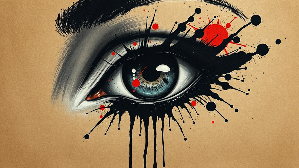 A striking portrait of an eye, splattered with vibrant paint and abstract stains, set against textured brown paper, designed in a noir comic art style with gothic black and white tones. Influenced by the angura kei movement, the piece merges elements of monumental ink paintings and dramatic chiaroscuro, blending biomorphic shapes with the fluidity of oil painting techniques. Emphasizing strong contrasts and an elongated vertical composition, the artwork evokes a surreal and mysterious atmosphere.