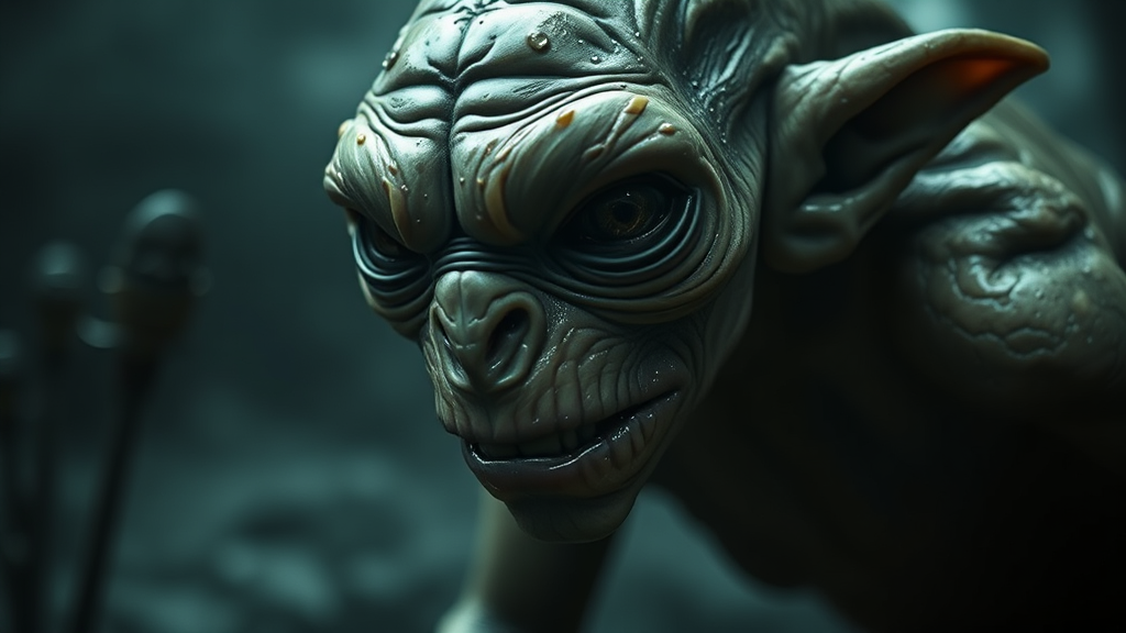 A striking portrait of Gollum from J.R.R. Tolkien's Lord of the Rings, captured in a dark, morbid atmosphere. The scene is rendered with octane for hyper-realistic and hyper-ornate details, presenting Gollum with wet, gleaming skin under dense atmospheric conditions. Photographed as if by Irakli Nadar and Reylia Slaby, the composition evokes an epic and dramatic mood, with an empty, eerie aura. The imagery resembles high-definition trail cam footage, showcasing intricate textures and fine details, all contained within a creepy yet captivating frame. The aspect ratio is tall, enhancing the unsettling elegance of this iconic character.