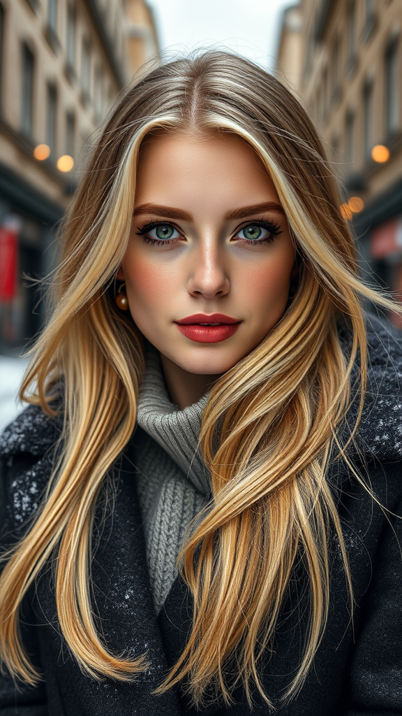 A striking portrait photograph of a stunning Norwegian woman in chic winter attire with flowing, golden blonde hair and an enticing gaze. Her naturally freckled, perfectly symmetrical face is enhanced by subtle makeup, exuding charm. She's poised against an urban snowy street backdrop, exuding modern elegance. The composition is intricate and sharply focused, employing medium shot for a captivating centered image. The scene is bathed in bright, diffused light, accentuating a mystical fog, fit for social media spotlight. Presented in vivid HDR quality for an ultra-realistic finish, steering clear of distractions for a singular portrayal of beauty within an upscale city setting.