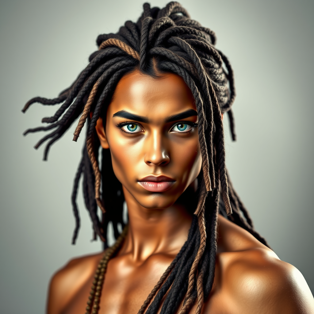 A striking portrait photograph of an androgynous figure inspired by Hanuman, characterized by an oval-shaped jaw and delicate features. The face is beautifully composed with bright, captivating blue-green eyes that draw you in. The hair is styled in intricate dreadlocks, complemented by long, flowing bangs and a sleek ponytail cascading down the back. Influenced by the elegance of Hindu art, this image embodies a harmonious blend of strength and grace.