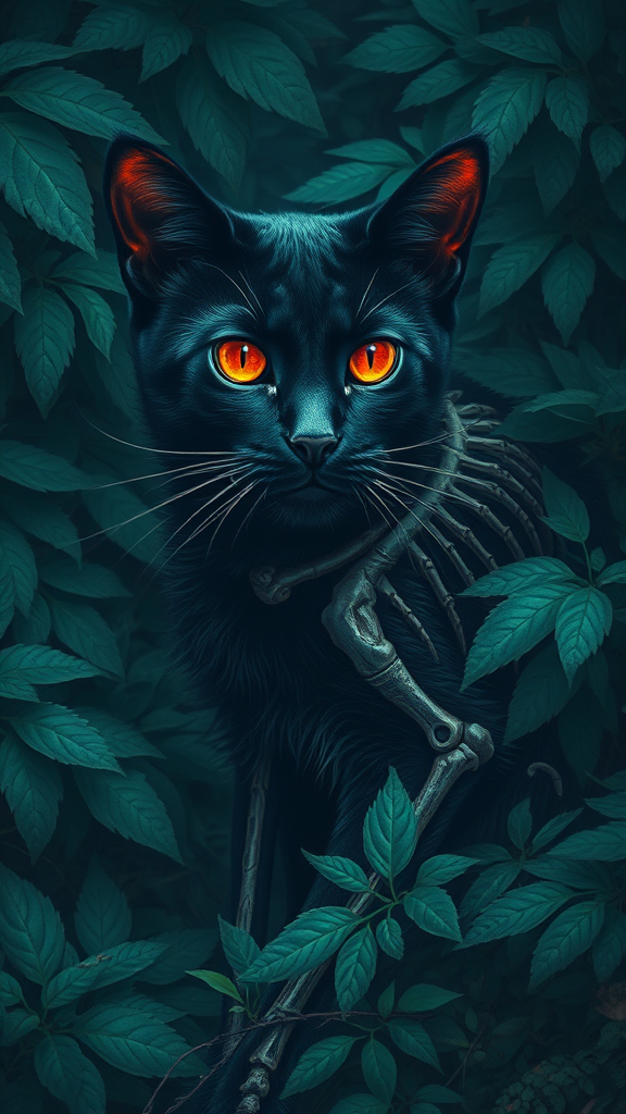 A striking portrayal of a black cat immersed in junglecore aesthetics, where haunting imagery meets the stylistic influence of Jan Matejko and the spirit of Miyamoto Musashi. The cat exudes raw character, embodied in dark teal and light red hues, its skeletal outline weaving through dense, verdant foliage. A mystical and ethereal atmosphere envelops the scene, as the cat's piercing eyes reflect wisdom and mystery within this compelling visual narrative.