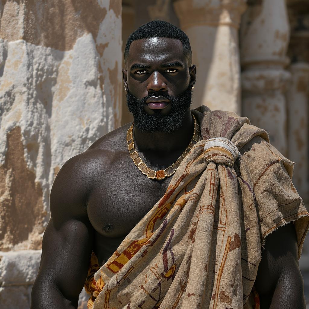 A striking portrayal of a Black man draped in weathered, ancient cloth, standing against a captivating, detailed backdrop. His physique is powerful and statuesque, complemented by an undeniably handsome face rendered with lifelike precision. The scene is bathed in crisp, natural lighting, enhancing the photorealism and showcasing an intricate interplay of textures. The composition, crafted with an 8k level of detail, exudes an artistic synergy akin to the styles of Artgerm, Greg Rutkowski, Alphonse Mucha, Loish, and WLOP, capturing trending elements and a modern artistic allure.