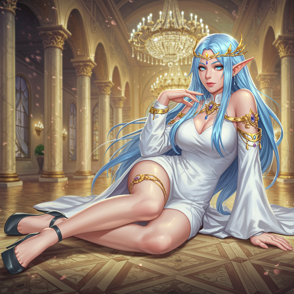 A striking portrayal of a character with a detailed face and piercing blue eyes, featuring a flowing half-tied braid of long azure hair. She is adorned with an elegant elven tiara, circlet, bracelet, and amulet, all intricately designed. Her graceful form is complemented by an off-shoulder white dress with long sleeves and a matching white cloak. She has a tiny waist, ample bust, and thick thighs, accentuating her feminine physique. Her pale, milky-white skin emanates ethereal beauty. The intricate gold leaf circlet adds to her allure. She reclines gracefully on the floor of a grand hall adorned with chandeliers and towering columns. Her high heels are visible, contributing to her elegant posture. This masterpiece combines photorealism and hyperrealism in an illustration style. The scene captures her in a moment of serene poise, with no distortion or unwanted deformities.