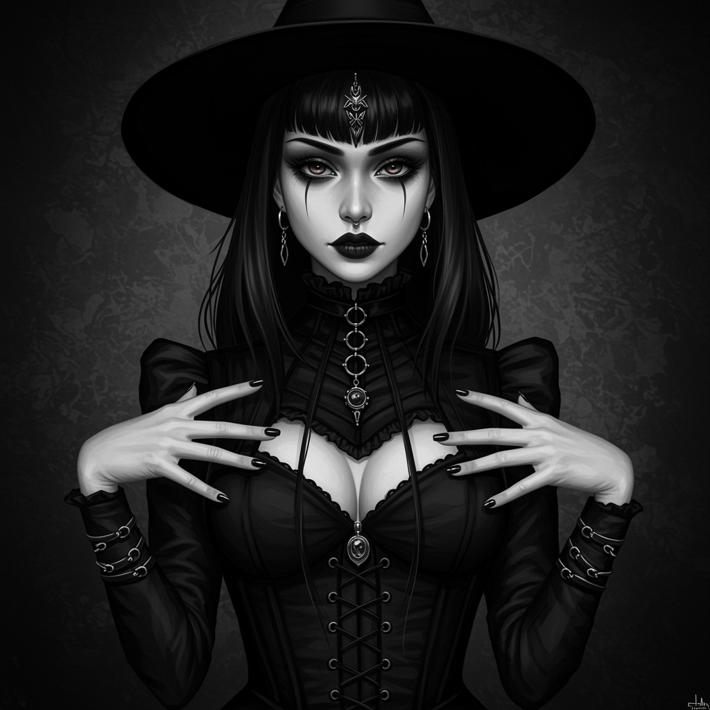 A striking portrayal of a woman clad in a monochrome ensemble, embodying the essence of a fashionable dark witch. Her presence is reminiscent of WLOP’s ethereal characters, with a high-fashion twist. The portrait captures the mystique of a dark witch, blending elements of Guweiz's captivating style and Loish’s fluid touch. The digital artwork is rich with detail, evoking gothic horror vibes, featuring a goth girl with entrancing, shadowed features. Her eyes hold a deep, enigmatic allure, with intricately woven accessories that accentuate her gothic elegance. The overall aura is darkly enchanting, encapsulating the spirit of a sophisticated witch from another realm.
