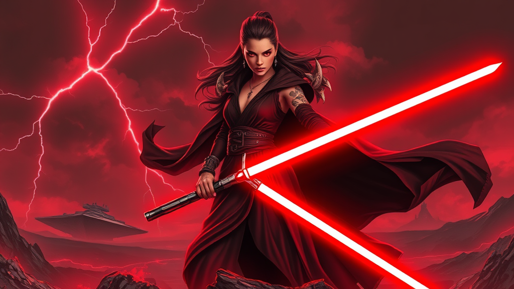A striking poster of a fierce female Sith Lord from the STAR WARS universe, set against a backdrop of a dark, stormy sky with flashes of lightning. She stands confidently on a rocky outcrop bathed in crimson light, her flowing black robes billowing in the wind. Her intense, glowing red eyes mirror the pulsating energy of her crimson double-bladed lightsaber. Her features are sharp and defined, framed by intricate, tribal tattoos and a menacing crown. In the distance, ominous silhouettes of Star Destroyers loom, adding a sense of impending doom and galactic power. The overall atmosphere is one of mystique and dark elegance, capturing the raw strength and enigma of the Sith.
