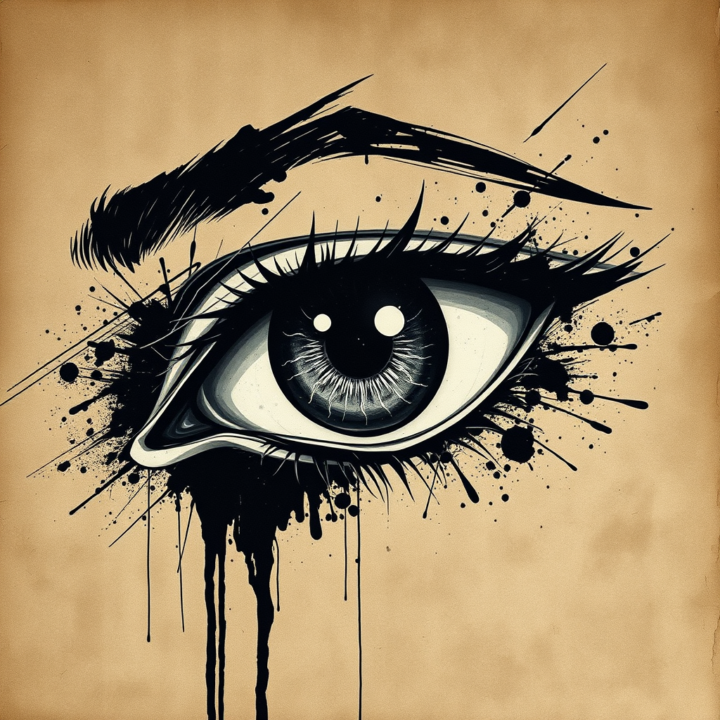 A striking print of an eye on weathered brown paper, dynamic splashes of paint and stains enhancing its intensity, rendered in the style of noir comic art with gothic black and white tones, reminiscent of angura kei aesthetics. The piece carries the grandeur of monumental ink paintings while incorporating the dramatic interplay of light and shadow found in chiaroscuro portraitures. The design is biomorphic, evoking organic forms, as if an oil painter captured a fleeting, expressive moment. The composition is elongated with an aspect ratio of 1:2, maintaining a bold and stylized approach.