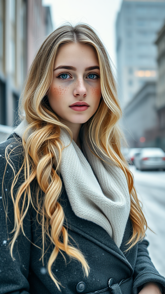 A striking professional portrait photograph featuring a stunning Norwegian girl clad in stylish winter attire, her long, wavy blonde hair gently framing a face sprinkled with freckles. Her features are beautifully symmetrical, accentuated by subtle and natural makeup. She stands against a wintry urban backdrop, with pristine snow blanketing a chic, modern cityscape. The image captures ultra-realism with concept art overtones, showcasing elegance through intricate, highly detailed resolution, with sharp focus and exquisite depth of field at f/1.8, shot with an 85mm lens. It is a medium shot employing bright, softly diffused lighting, with a touch of volumetric fog creating an ethereal atmosphere. The scene is presented in high dynamic range, trending on platforms like Instagram and Tumblr for its captivating and flawless 8K quality, with the essence of easynegative and the artful serenity of chill winter vibes.