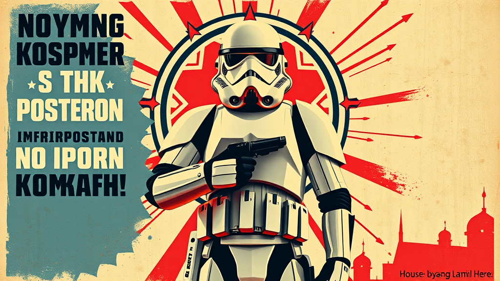 A striking propaganda poster showcasing a Stormtrooper reminiscent of Soviet Union recruitment art, featuring bold colors and dynamic design elements. The Stormtrooper stands tall and proud in full armor, surrounded by an integrated symbol that emphasizes unity and strength. Inspired by retro style and iconic imagery, the poster includes inspiring slogans that convey a powerful message of solidarity and resilience. The visually compelling and thought-provoking design captures attention and stirs emotion, reinforcing the call to action.