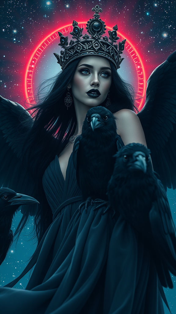 A striking queen of ravens, draped in a silk gossamer dress, stands amidst a galaxy of stars, her black plumes contrasting against the cosmic backdrop. Her icy blue eyes, reminiscent of Pantone 2766, and black lipstick add to her enigmatic allure, exuding the essence of a dramatic femme fatale. With flowing black hair cascading like a waterfall, she commands her raven entourage in an ethereal display of power. An intricate crown, adorned with celestial ornaments, rests upon her head, while god rays illuminate her presence, casting shadows in a macabre yet mesmerizing environment. The scene, captured in a low angle shot, highlights her ethereal grace and control. The iridescent red halo behind her pulsates with life, enhancing the psychedelic atmosphere reminiscent of a World of Warcraft realm. The style reflects Greg Retkowski's influence, producing an ultra-realistic, highly detailed portrait with elements of dark fantasy and atmospheric hyperrealism. A wide-angle cinematic view captures the epic scale of the queen's domain, rendered with octane precision, sharp focus, and photorealistic detail, creating a breathtaking illustration that embodies the power and elegance of this regal figure.