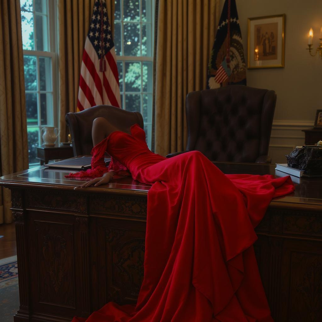 A striking red dress elegantly draped over the edge of a polished wooden desk in the iconic White House Oval Office, with soft, ambient lighting highlighting the room's opulent details and a subtle hint of a mysterious woman's presence. f2.8 nrealfixer, nfixer.