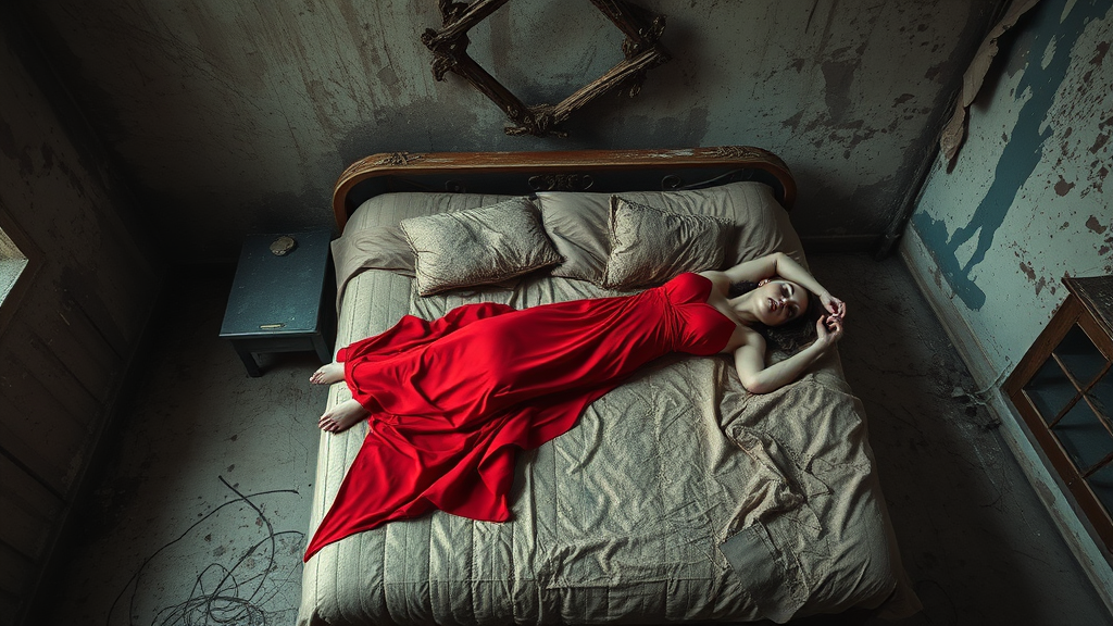 A striking red dress, seemingly forgotten, lies elegantly across a worn-out bed in a decaying post-apocalyptic room; the space is dusty and tattered, evoking an unreal atmosphere, captured in high-definition detail with octane rendering; a woman’s body is present, adding a hauntingly human element to the otherwise desolate scene.