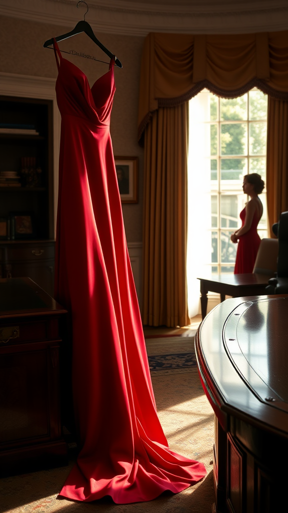 A striking red evening gown elegantly draped over the side of a polished mahogany desk, capturing the essence of the iconic White House Oval Office interior; the room softly lit to create a dramatic ambiance with shadows and highlights; a sense of anticipation as a glimpse of a woman's silhouette is reflected softly in the nearby window, hinting at her presence, creating a blend of power and allure with an f2.8 lens effect enhancing the depth of field, inviting curiosity and intrigue within a prestigious setting.
