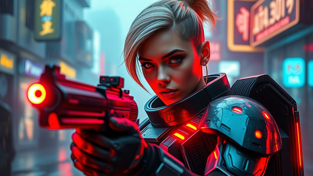 A striking representation of a young woman exuding beauty and strength, donned in sci-fi medium armor with vivid neon accents that illuminate her presence. Her white eyes exude mystery, set against an urban backdrop with rain-soaked streets and glowing neon lights. Captured in stunning detail, her dynamic posture conveys readiness, wielding a futuristic laser gun with sophistication and power. Her perfectly symmetrical face radiates confidence, complemented by a daring cyberpunk hairstyle. Encased in a futuristic army uniform reminiscent of Star Wars nostalgia, her appearance is accentuated by intricate detailing and HDR effects. The scene is photorealistic, trending on art platforms like ArtStation and CGSociety, inspired by the style of artists like Artgerm, Greg Rutkowski, and Viktoria Gavrilenko. The fog-laden atmosphere, complete with reflections and dramatic lens flares, enhances the ethereal qualities of this captivating art piece.