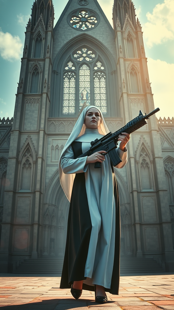 A striking scene featuring a graceful nun brandishing an imposing machine gun, set against the backdrop of a grand cathedral. The outdoor environment is bathed in a mystical light, evoking an ethereal fantasy atmosphere. The style draws on surreal and dreamlike elements with hints of Die Brücke's vivid and emotive aesthetics. Towering arches and intricate stained glass windows lend an air of awe and wonder, enhancing the surrealism of the scene.