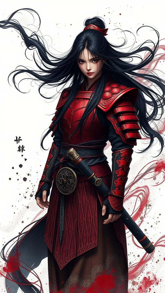 A striking scene featuring a single female warrior with long, flowing black hair standing against a stark white background. Her penetrating black eyes gaze directly at the viewer, exuding an aura of strength. She wears arm guards and traditional tabi footwear, and her hair seems animated, almost floating around her. Her face is marked with subtle streaks of blood, adding to the intensity of her expression. The warrior is clad in intricate red armor that glistens with exquisite detail, reminiscent of fractal designs. The backdrop is an abstract composition, blending elements of ink wash painting with a hint of surrealism, enhancing the overall mystique. This ultra-realistic depiction is rendered with masterful precision and textures, creating a compelling 32k resolution unity 8k wallpaper that embodies the highest quality of digital art.