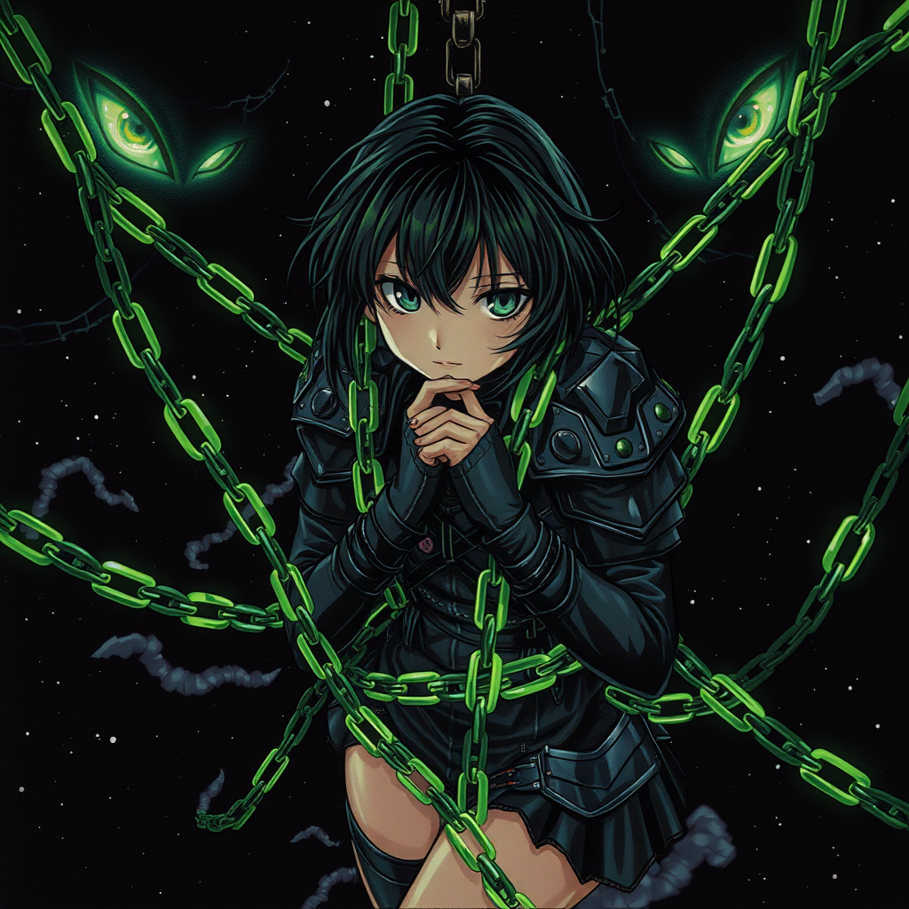 A striking scene in the style of a 90s dark fantasy anime OVA captures a beautiful girl with a well-defined figure, clad in intricately detailed dark armor and leathers. She is entangled in vibrant, acid green chains that extend from the edges of the frame. Suspended in the void of an apocalyptic, starless black cosmos, her eyes reflect a mix of defiance and serenity. Mysterious, luminescent eyes peer at her from the darkness, adding an eerie, otherworldly atmosphere. The illustration, reminiscent of the signature grainy texture of 90s classics like Cowboy Bebop, Neon Genesis Evangelion, and Berserk, brings forth a fusion of haunting beauty and ominous tension. Subtle wisps of ethereal mist swirl around her, casting a soft glow against the stark backdrop, while faint echoes of forgotten constellations hint at the lost grandeur of this enigmatic world.