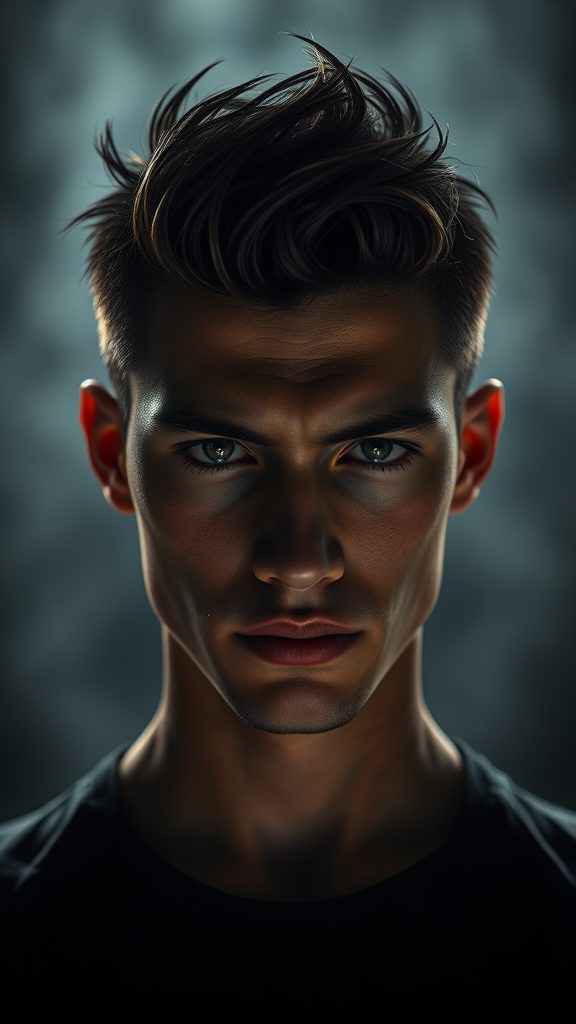 A striking three-quarter close-up of a 30-year-old man with a slender athletic build and captivating features, his expression a blend of frowning innocence. His hair is carefully styled, contrasting against an oppressive background that exudes a sense of dramatic tension. The atmosphere is steeped in a gloomy horror, enhanced by contrasting lighting and backlighting that creates an expressive, cinematic quality. Photographed from a low angle with a DSLR, the technical details include an aperture of f/7, a shutter speed of 1/100 sec, and an ISO of 150. The image is hyper-detailed and photorealistic, capturing natural reflections and cinematic anime lighting for a stunning visual experience. The scene maintains symmetry and balance while avoiding elements of deformation, ensuring a clean and precise composition.