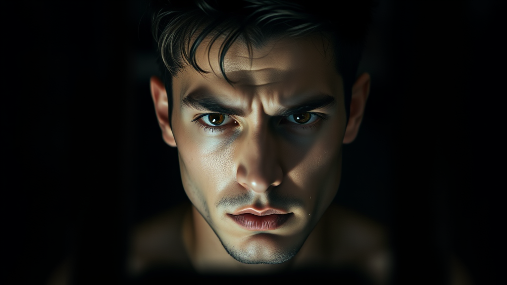 A striking three-quarter close-up portrait of a 30-year-old man with a slender, athletic build and a captivating face. He displays a frowning yet innocent expression, with his hair subtly highlighted by dramatic backlighting, adding depth. The oppressive, contrasting background amplifies the tension, creating a gloomy, horror-laden atmosphere that feels crushing. The image is captured in a cinematic style, photographed from a low angle with a DSLR, using an aperture setting of f/7, a shutter speed of 1/100 sec, and ISO 150. This results in a super detailed, hyper-realistic portrayal, highlighting the textures and natural reflections in the scene. The cinematic lighting gives an anime-like quality while infusing the shot with bright, almost blinding light that enhances the dramatic effect. Elements such as symmetry and minor deformations contribute to an otherworldly feel without compromising the overall coherence of the composition.