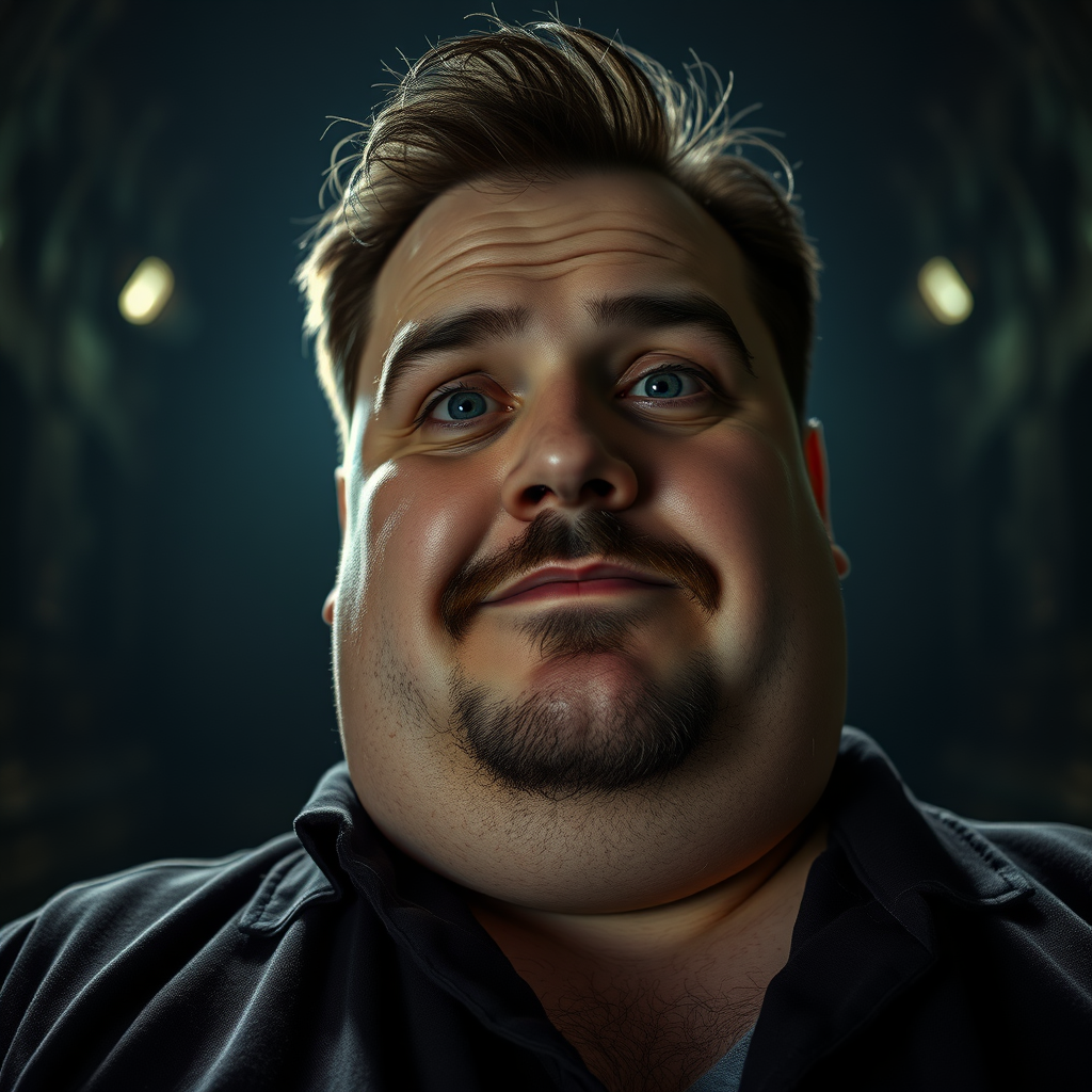 A striking three-quarter close-up portrait of a remarkably handsome 30-year-old man with an overweight physique and a captivating face. He exudes a curious and friendly expression, sporting a neat goatee and well-groomed hair. The background adds an oppressive contrast, offering a dramatic, expressive environment with a gloomy, horror-infused atmosphere. The cinematic shot, captured from below with a DSLR, uses an aperture of f/7, a shutter speed of 1/100 sec, and ISO 150. It is super detailed and hyper photorealistic, featuring natural reflections and cinematic lighting. Bright lights create a backlit silhouette, enhancing the textures and symmetry while avoiding incorrect anatomy and unwanted duplications.