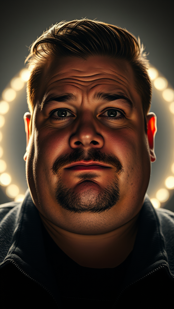 A striking three-quarter close-up portrait of an exceptionally handsome 30-year-old man with an overweight figure and captivating face. He exudes a curious and friendly demeanor, sporting a well-groomed goatee and neatly styled hair. The background is oppressive and contrasting, creating a stark, dramatic atmosphere with an inner backlighting effect. The scene is captured in a cinematic style with a DSLR, set at an aperture of f/7, a shutter speed of 1/100 sec, and ISO 150. The image is super detailed, hyper photorealistic, featuring natural reflections and cinematic lighting that gives an anime-like quality. Please avoid unwanted distortions or unrealistic features such as deformed anatomy, duplicates, or low-quality artifacts, ensuring the portrayal remains authentic and visually engaging.