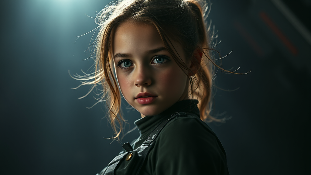 A striking three-quarter portrait featuring a beautifully captivating young girl with a slender, athletic build. Her face, a blend of intrigue and innocence, is framed by flowing hair. She dons a combat sci-fi jumpsuit reminiscent of Battlestar Galactica, evoking the spirit of a 90s sci-fi series set against the vastness of deep space. The oppressive background contrasts sharply, creating a gloomy, horror-infused atmosphere, with dramatic backlighting hinting at an internal source of illumination. This cinematic shot, photographed from below using a Canon EOS 5D Mark IV DSLR, boasts an aperture of f/8, a shutter speed of 1/250 sec, and ISO 100 settings. The hyper-photorealistic portrayal is enhanced by detailed textures and natural reflections, delivering a stunning visual feast. The lighting is theatrical, with hints of tinted glass and gold accents on the jumpsuit, adding to the high-tech, sci-fi aesthetic. The girl's pose and expression convey a sense of both strength and vulnerability, a juxtaposition heightened by the grim, space-oppressive backdrop. The symmetry of her form is accentuated by the suit's rivets, painting a picture of an enigmatic protagonist amidst a chaotic universe. The image's intricate details and lifelike accuracy invite the viewer to explore this stark yet mesmerizing world.