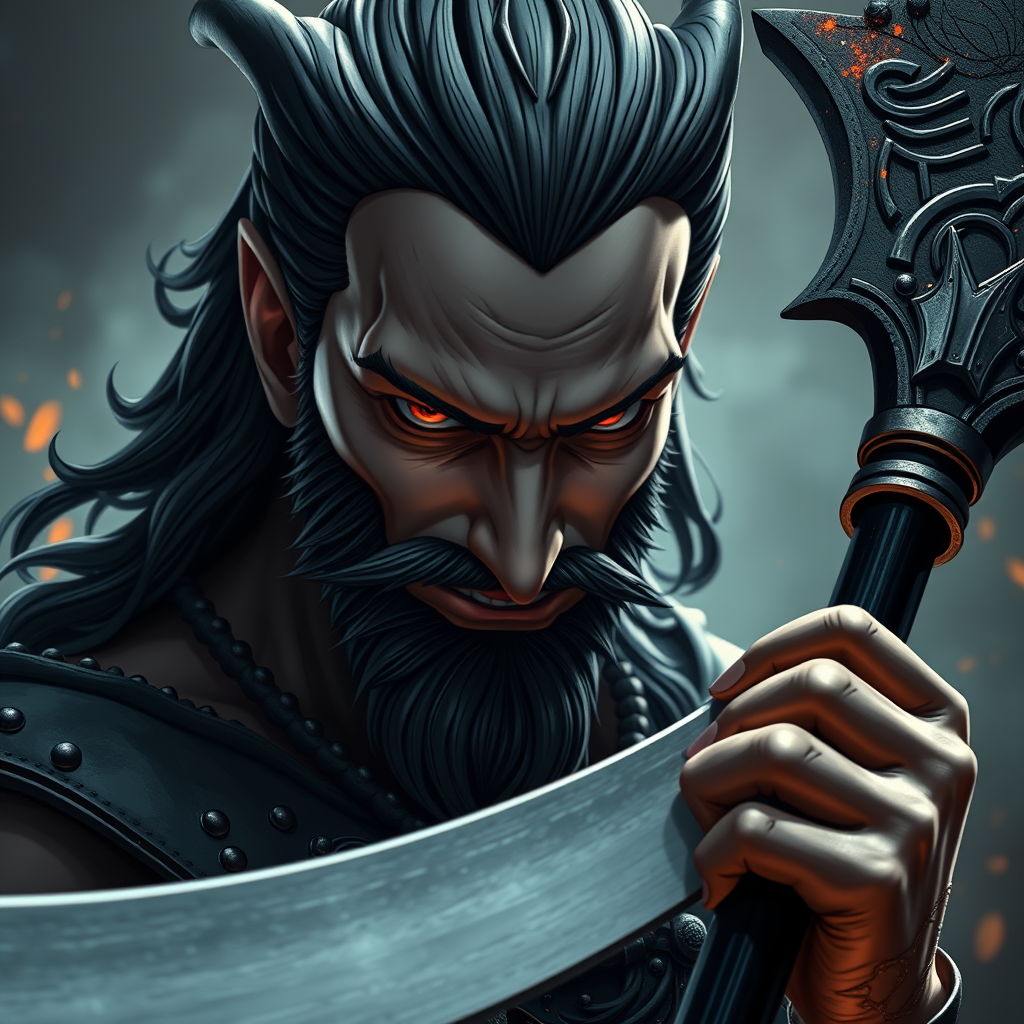 A striking three-quarter portrait of the sinister Greek god Hades, exuding an air of power while holding a sleek scythe. His face is stunningly detailed, with a cruel, mischievous smirk. Hades gazes downward, locking eyes with the viewer, his symmetrical burning eyes capturing attention. His skin is flawless and he stands emboldened, captured with the precision of a DSLR 150mm lens at a shutter speed of 1/100, showcasing raw, vibrant colors. The scene is dramatic and intricately detailed, set against a fantasy backdrop. The lighting is cinematic, highlighting textures with natural reflections. Hades adopts an action pose with a slightly asymmetrical stance, all rendered in breathtaking 8k UHD. The character design embraces an anime aesthetic, ensuring softness and elegance. Bright, blinding light and decorative rivets enhance the symmetrical appeal. Attention to proportions ensures a realistic portrayal, avoiding deformations or anatomical errors, with an emphasis on singularity and clarity of form.