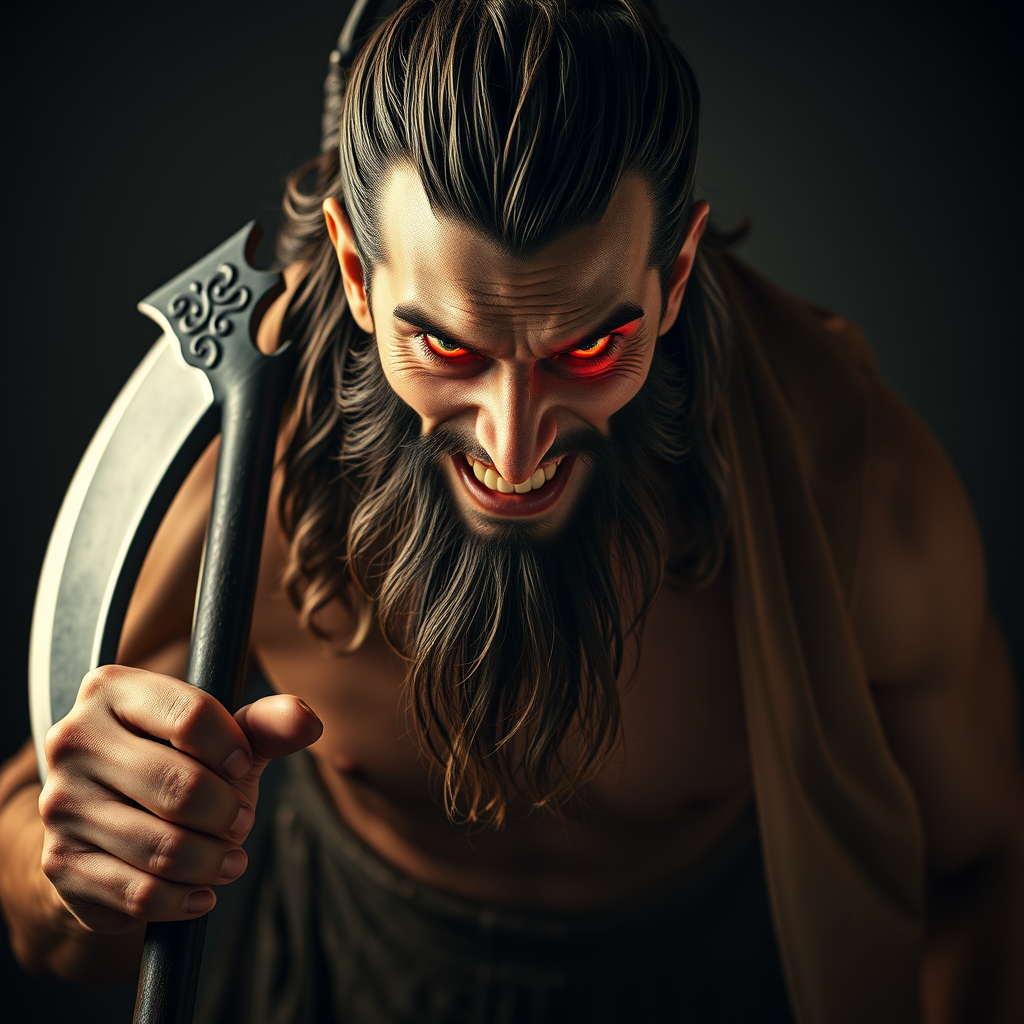 A striking three-quarter portrait of the sinister Greek god Hades, wielding a scythe. His face, stunning yet cruel, displays a mischievous smirk as he gazes downward towards the viewer, conveying both authority and malice. His burning eyes are symmetrical and intense, set against flawless skin, while cinematic lighting emphasizes the drama. Captured as though with a DSLR and a 150mm lens, the ultra-detailed image features the textures of natural reflections and an intricate fantasy background. His pose, dynamic and asymmetrical, suggests action and power, while 8k UHD quality ensures every detail is captured. A sense of emboldenment radiates from Hades, standing in heels amidst blinding, bright light.