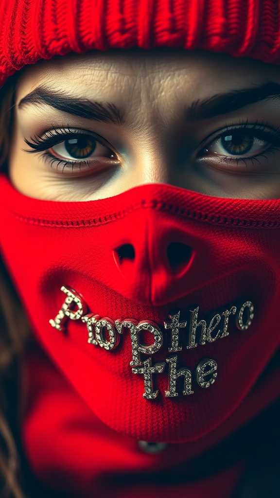 A striking, ultrarealistic portrait of a young, beautiful woman wearing a vibrant ski mask in a bold shade of fiery red, her eyes captivating and intensely focused. The close-up shot emphasizes the intricate details of her expression, with the ski mask's texture vividly present. Her lips part slightly to reveal a dazzling set of grillz, with the word "Prompthero" crafted in an edgy, avant-garde font, shimmering prominently. The overall atmosphere is infused with a sense of mystery and edgy allure, capturing both strength and enigma.