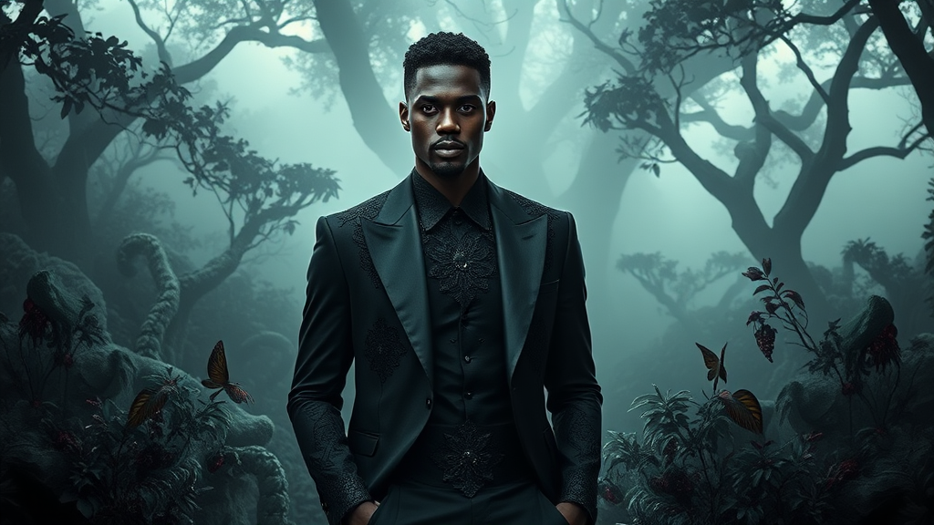 A striking visual of a black man exuding confidence and elegance in a gothic paradise setting, dressed in avant-garde fashion pieces with intricate lace and velvet textures, surrounded by lush, shadowy landscapes and ethereal mist that enhances the mysterious allure of the scene.