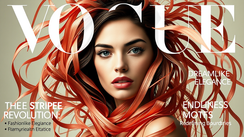 A striking VOGUE magazine cover showcases a captivating woman enveloped in a mesmerizing cascade of ribbons. These lines twist and curl around her form, seamlessly merging her silhouette into the dynamic, dreamlike pattern. Her expression is serene, partially obscured within the hypnotic ribbons, imbuing her with an ethereal, otherworldly aura. The VOGUE logo stands prominently at the top, with a metallic sheen contrasting against the abstract design. Cover highlights include: "The Stripe Revolution: Fashion’s Bold Frontier," "Dreamlike Elegance: Where Art Meets Style," and "Endless Motifs: Redefining Design Boundaries."