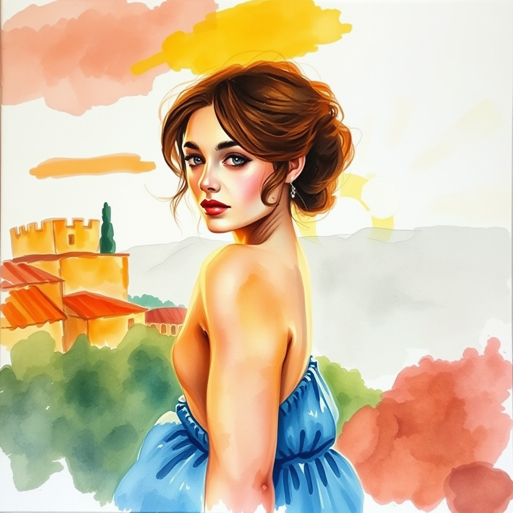 A striking watercolor artwork on canvas depicting an elegant woman, inspired by the style of Paul Cézanne, featuring the ambiance of Aix-en-Provence with post-impressionist influence, impressionistic landscape elements, and a serene sunset in soft pastel hues. The painting is characterized by a dreamy blur, with pronounced blurry forms, and dense, expressive brushstrokes.