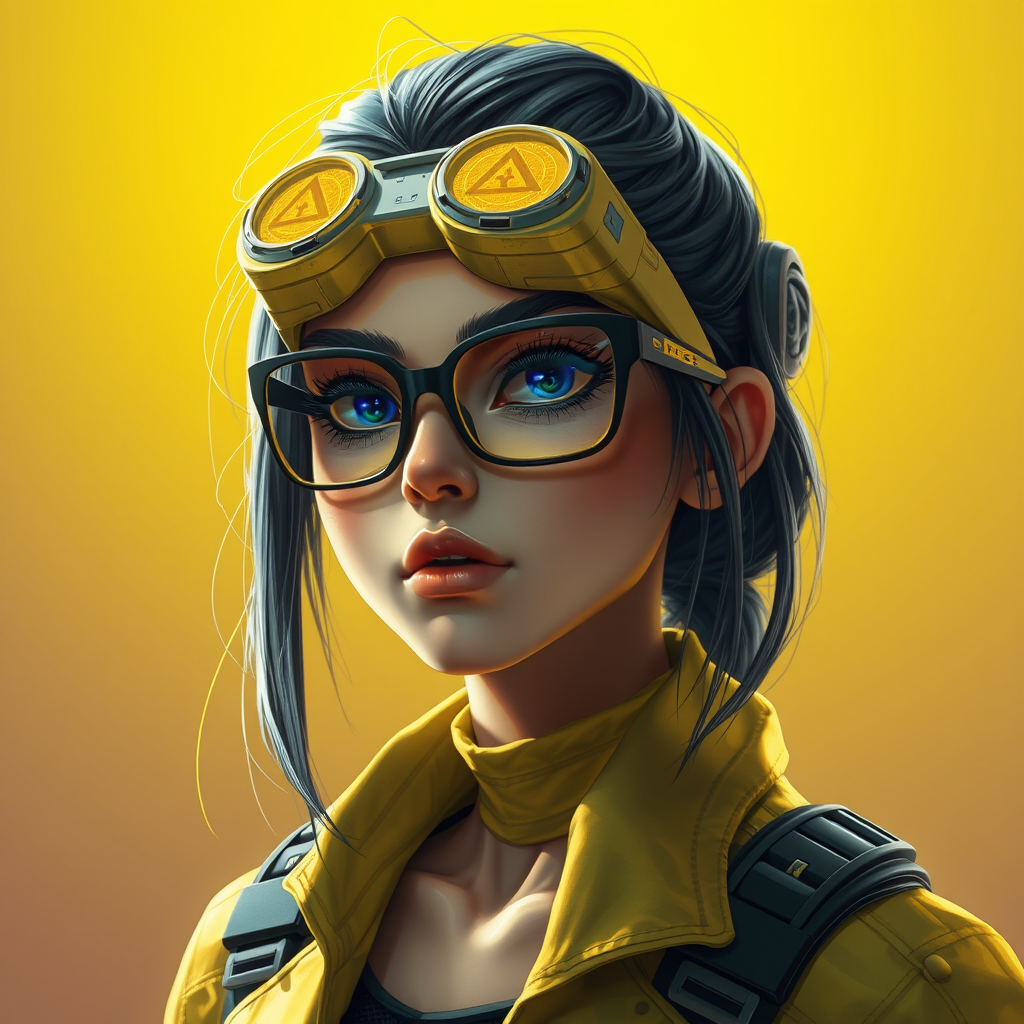 A striking woman adorned with sleek glasses stands as a testament to the cyberpunk art style, influenced by the works of Marek Okon and Dan Mumford. Her presence embodies a futuristic soldier girl, crafted in the detailed artistry of Maya rendering. This portrait captures the essence of a realistic yet cute girl, illuminated by the subtle intrigue of Illuminati embellishments. The artwork, touched by the creative flair of names like Midjourney and Nartfixer, is enriched with a vibrant yellow hue. Falling into the realms of CGI, the image showcases an octane-rendered 3D effect, with a doll-like precision. Despite its low-resolution and textural challenges such as missing fingers or extra digits, the piece triumphs with a unique character. Though cropped, and faced with common artistic hurdles like JPEG artifacts, signature marks, and occasional anatomical distortions like extra limbs or imperfect hands, the art maintains its charm. With elements potentially out of frame, and the possibilities of tiling, deformation, and blurring, the portrait emerges through these challenges to captivate as perfectly imperfect art, carrying a hint of raw, unrefined beauty, conspicuously without watermarks.