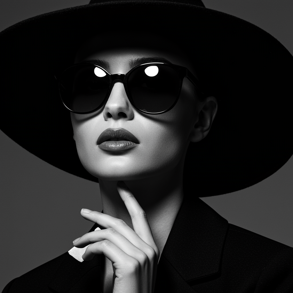 A striking woman dons sleek black sunglasses and a chic hat, captured in the timeless elegance of black and white imagery. With the influence of vray tracing and the precision of a Tamron SP 70-200mm f/2.8 Di VC USD G2 lens, the photograph embodies bold fashion photography. Luminous shadowing highlights her features in this crisp and clean close-up. The aesthetic is one of sophistication and allure, where every detail is sharp and exaggerated, capturing the essence of stylized glamour.
