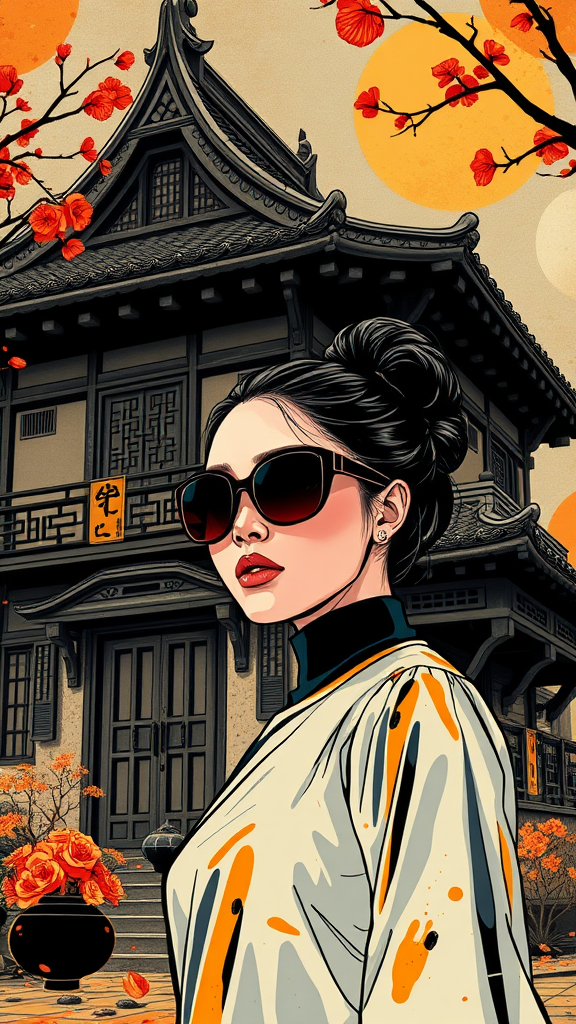 A striking woman in futuristic sunglasses stands beside an intricately designed old-fashioned house, her presence echoing the essence of cyberpunk manga. Influenced by the aesthetic of Ross Tran, the scene bursts with Chinese iconography, featuring vibrant splashes of dark black and light amber hues. Bold graphic illustrations weave through the composition, paying homage to Chinese tradition while intertwining with dynamic, multi-layered color fields. The atmosphere conveys an intriguing blend of old-world charm and futuristic allure, set within an imaginative and visually arresting landscape.