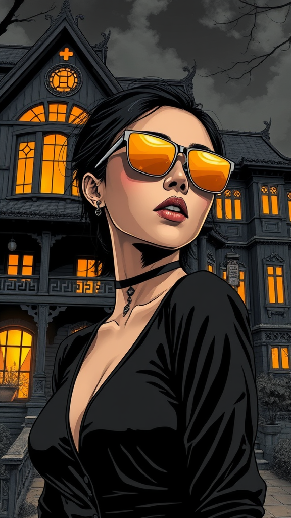 A striking woman in sleek sunglasses stands beside a vintage mansion, blending cyberpunk manga aesthetics with Ross Tran's distinctive style. The scene is infused with Chinese iconography, featuring a palette of dark black and glowing light amber. The composition is a bold graphic illustration, interwoven with layers inspired by Chinese tradition. Multi-layered color fields create depth and intrigue, as the woman exudes a confident aura against the backdrop of contrasting textures and shadows.