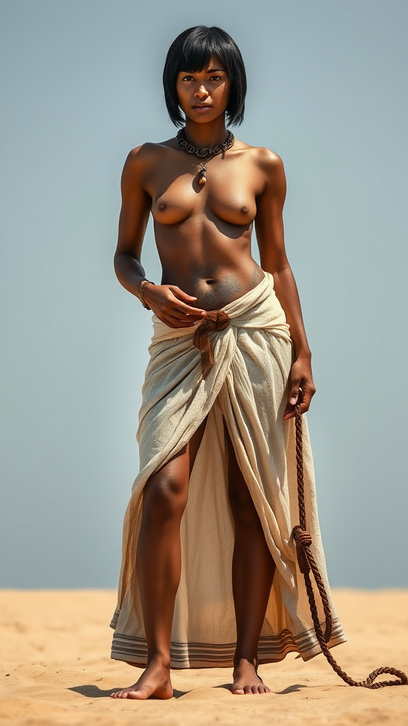 A striking woman of Mediterranean descent, once a slave in ancient Rome, stands with confidence, her athletic build showcased in a flowing, slightly worn Roman robe. Her short, straight black hair glistens under the bright sun, highlighting her fierce visage. She is grounded on a warm, sandy surface, her bare feet whispering tales of resilience. A shimmering belly piercing catches the light, complementing an intricate and expansive tattoo that weaves stories across her skin. Around her neck, a bold leather choker rests, symbolizing strength, while a weathered leash loosely encircles her ankle, a nod to a past she has transcended.