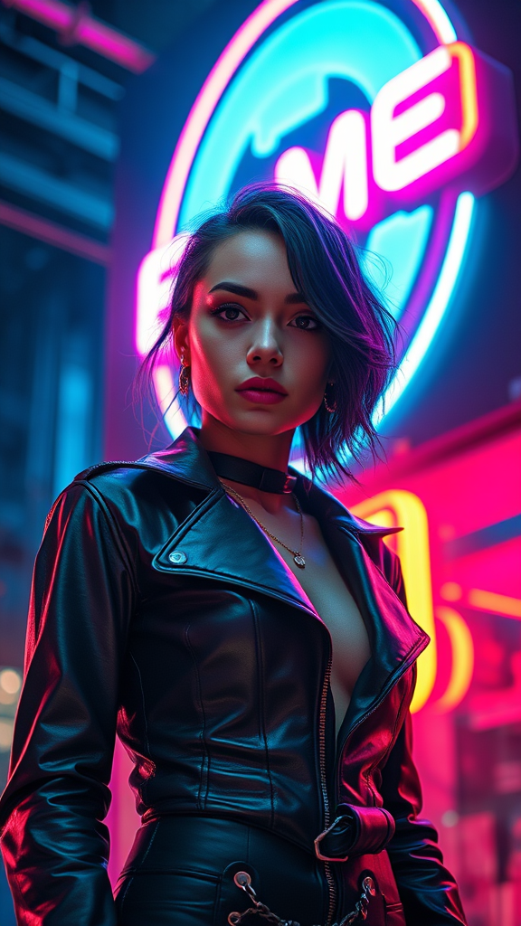 A striking woman stands confidently in front of a vibrant neon sign that illuminates the night with an array of vivid colors. Her appearance blends hyper-realistic sci-fi elements and steelpunk aesthetics, reminiscent of candid shots capturing iconic figures. Her attire fuses mote kei and leather/hide styles, embodying a futuristic elegance with an edgy twist. The scene reflects the dynamic energy of DC Comics universes, as though captured through the lens of a Sony Alpha A1, rendering every detail with crisp clarity – from the textures of her garment to the reflective glow of the neon hues that dance across her features.
