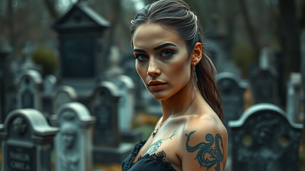 A striking woman stands gracefully amidst the gravestones of a cemetery, exuding charm and allure as she engages the viewer with a captivating gaze. Captured in a full-length portrait, the photograph showcases intricate details of her skin, with an 8k resolution revealing realistic textures and colors in high detail. Piercing elements add a touch of boldness, while the scene is enveloped in diffused, soft lighting that creates a shallow depth of field. The sharp focus and hyperrealism blend seamlessly with cinematic CGI lighting, ensuring a vivid portrayal. The composition avoids any distortions or errors, maintaining impeccable anatomy and proportions without any distractions or quality issues, delivering a flawless and immersive visual experience.
