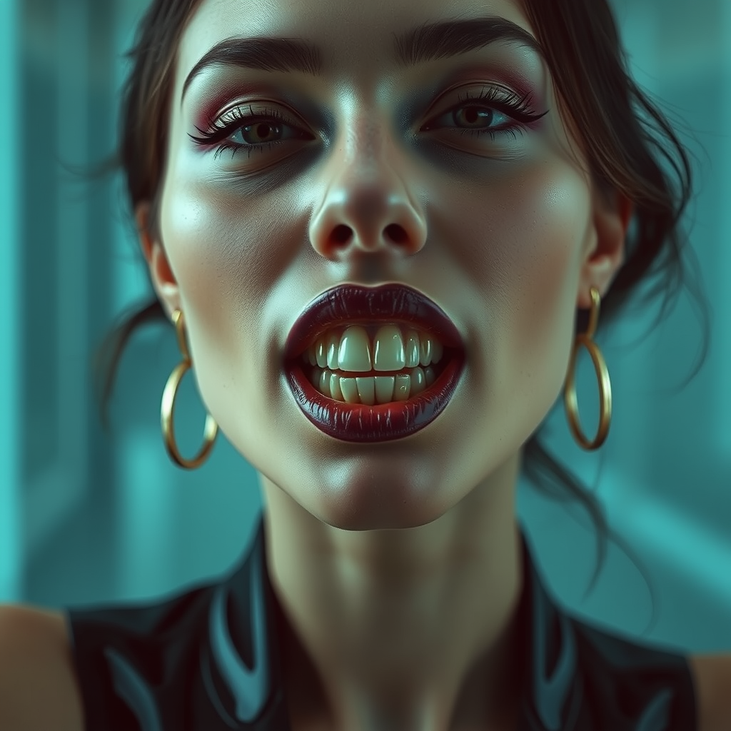 A striking woman with a prominent jawline and radiant gold teeth, captured in the essence of futuristic minimalism with restrained forms. Her presence exudes an air of dark romanticism, reminiscent of the Bechers' typologies, with a glossy finish that enhances the intricate details. The imagery is richly detailed, focusing on close-up shots that emphasize her unique features, set against a sleek and modern backdrop --ar 4:5 --s 300 --v 6.0 --style raw.